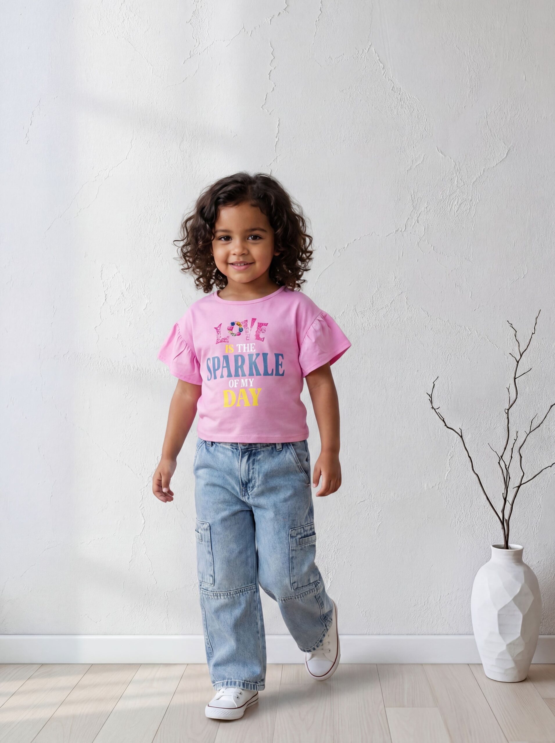 ملابس أطفال براند A&A بتهتم بالتفاصيل، عشان كدة الطباعة الملونة بجملة “Sparkle” ثابتة جداً ومش بتأثر مع الغسيل. التيشيرت ده مناسب جداً لـ بنات سن سنتين لحد ست سنوات وبيلبق جداً على الجينز أو الشورتات. اغسليه بماء بارد واكويه على الهادي عشان يفضل جديد دايماً في دولاب بنوتك. اختاري لطفلك الأفضل واطلبيه دلوقتي قبل الزحمة ونفاد الكمية.