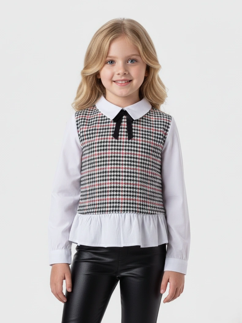 ملابس أطفال شتوية تجمع بين الأناقة والدفء من A&A. صممناها خصيصاً لتناسب بنات سن سنتين لحد ست سنوات. تتميز البلوزة بتصميم راقٍ جداً. يدمج التصميم بين قماش الكاروهات الكلاسيكي واللمسات العصرية. الياقة البيضاء المزينة بفيونكة تضفي فخامة واضحة. الأكمام الطويلة مصنوعة من قطن ناعم. تضمن هذه الخامة الراحة التامة لبشرة طفلتك.