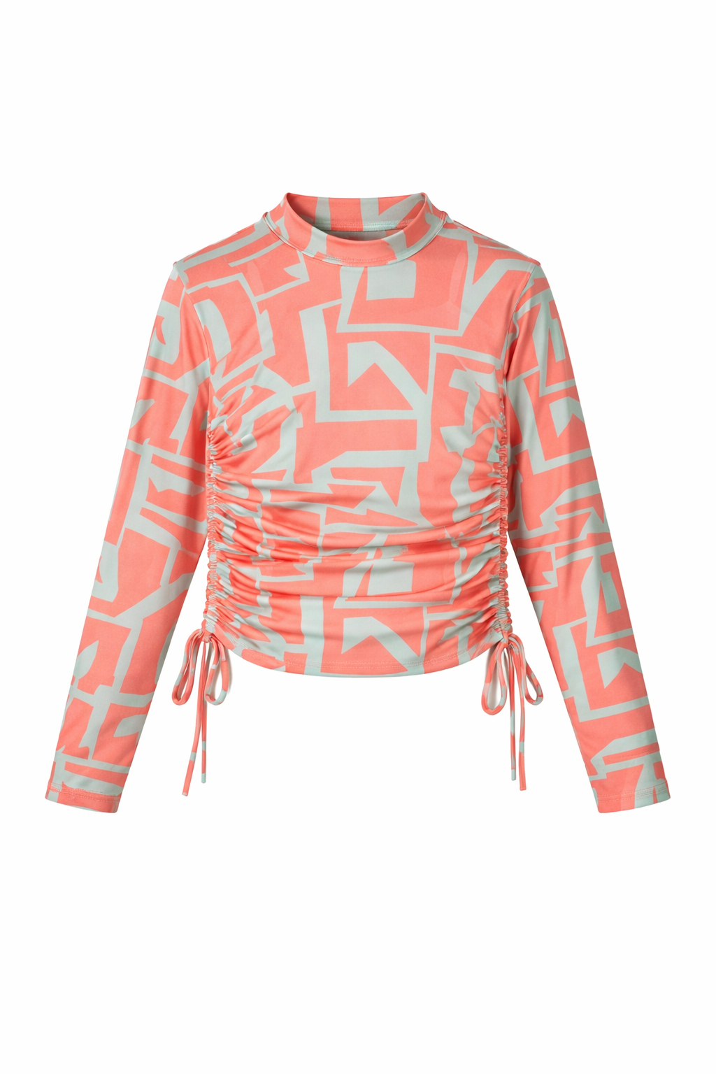 تتميز البلوزة بنقشات هندسية “مودرن” تدمج بين اللون المرجاني (Coral) واللبني، مع تفاصيل جانبية برباط (Side Cords) تمنح التصميم لمسة فنية فريدة.