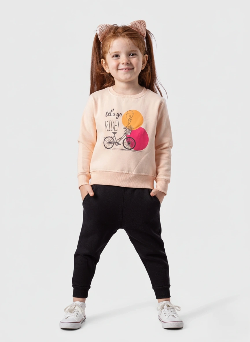 ملابس أطفال بنات شتوية مريحة ودافئة. طقم بيجامة كامل (سويت شيرت وسويت بانتس) بخامة قطنية ميلتون ناعمة. اللون خوخي مع بنطلون أسود، وتصميم مطبوع مرح “Let’s go ride!” مثالية لدفء وراحة طفلتك. لا تفوّتي هذه القطعة الأنيقة.