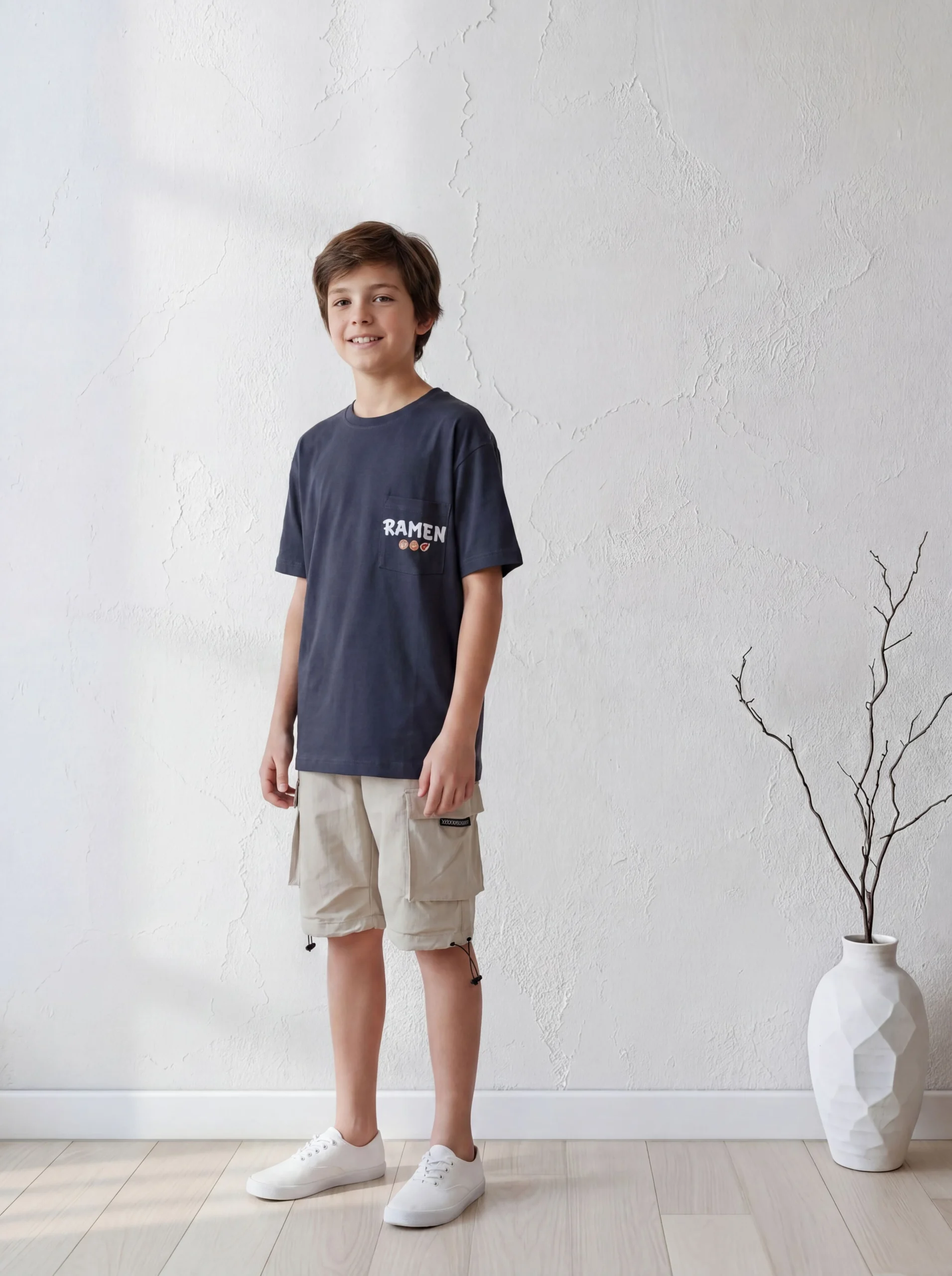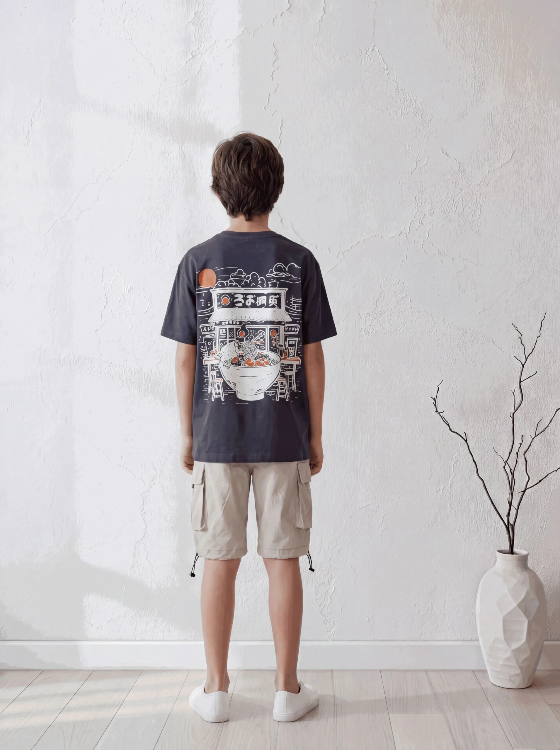 ملابس أطفال صيفية بتصميم “Ramen” الياباني المبتكر تقدمها ليكي براند A&A بجودة لا تقارن. التيشيرت مصنوع من قطن نقي ممتاز يمنح طفلك البرودة والراحة اللازمة في أيام الصيف الحارة. يتميز الموديل بلون رمادي فحم (Charcoal) فخم، مع جيب أمامي صغير وطبعة خلفية جرافيك ضخمة تعكس تفاصيل “مطعم الرامن” بأسلوب فني رائع. القماش معالج ضد الانكماش ليناسب نشاط فئة أولادى كبير اليومي.
