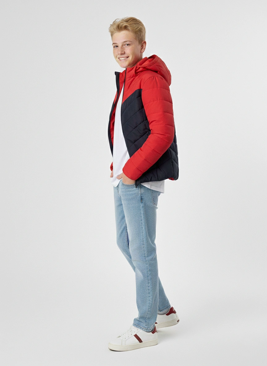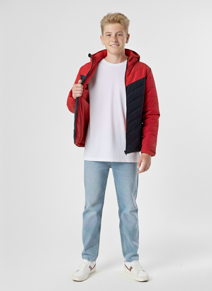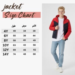 جاكيت شتوي أولادي منفوخ مبطن أحمر وكحلي بقلنسوة – جاكيت أطفال مقاس 4-14Puffer Jacket for Boys | جاكيت اولادي