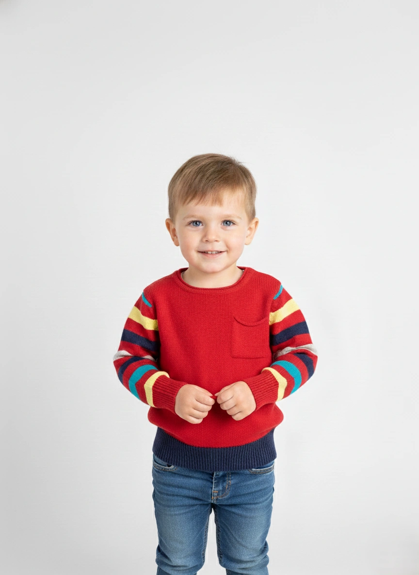 يتميز التصميم بياقة مستديرة وجيب جانبي أنيق جداً. تظهر الأكمام المخططة بألوان جذابة مثل الأصفر والكحلي واللبني. هذه التفاصيل تجعله قطعة فريدة في خزانة ملابس أطفالك هذا الموسم. السويتر مثالي جداً للخروج اليومي أو المناسبات العائلية.