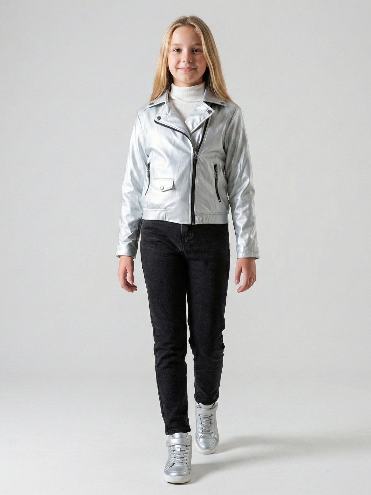 ملابس أطفال شتوية تمنح طفلتك بريق النجمات مع هذا الجاكيت الجلد الفضي من A&A. يتميز الموديل بتصميم “بايكر” عصري بياقة كلاسيكية وسحاب جانبي يضفي لمسة من الفخامة. استخدمنا أجود أنواع الجلد الطري لضمان راحة طفلتك وحرية حركتها الكاملة. الجاكيت مزود ببطانة داخلية ناعمة توفر الدفء اللازم في الأيام الباردة.