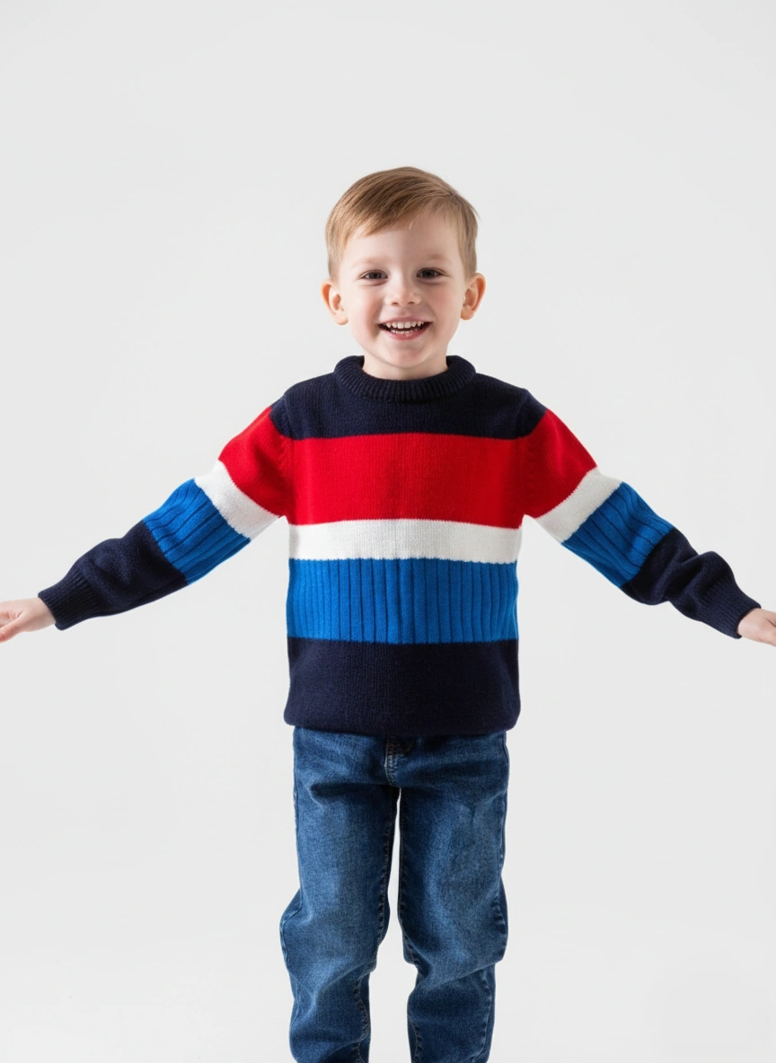 ملابس أطفال شتوية تجمع بين الدفء والشياكة بلمسة A&A الساحرة. السويتر مصمم بخامة تريكو عالية الجودة عشان يحمي طفلك من برد الشتاء القارص. التصميم بيتميز بألوانه القوية (الأحمر، الأبيض، والأزرق) اللي بتدي طاقة وحيوية للطفل في كل مشاويره. الخامة ناعمة جداً على البشرة ومش بتسبب أي حساسية، وده بيخليها مثالية للارتداء اليومي أو الخروجات المميزة. السويتر مناسب جداً لفئة أولادى بيبي اللي بيتحركوا كتير ومحتاجين راحة كاملة.