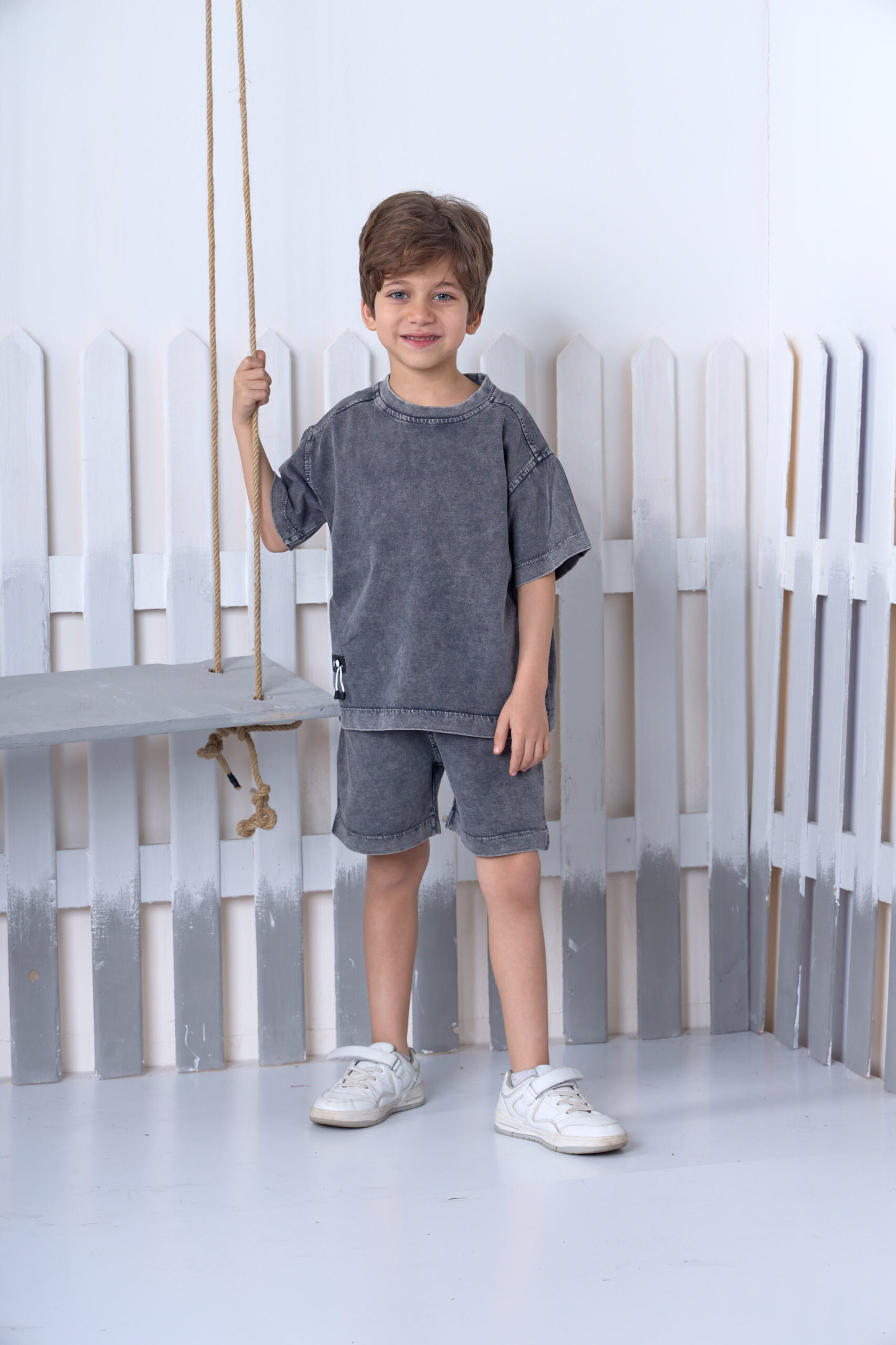 طقم أولادي صيفي رمادي أسيد واش – ملابس أطفال خروج صيفيAcid Wash Outfit for Boys | سوت أولادي