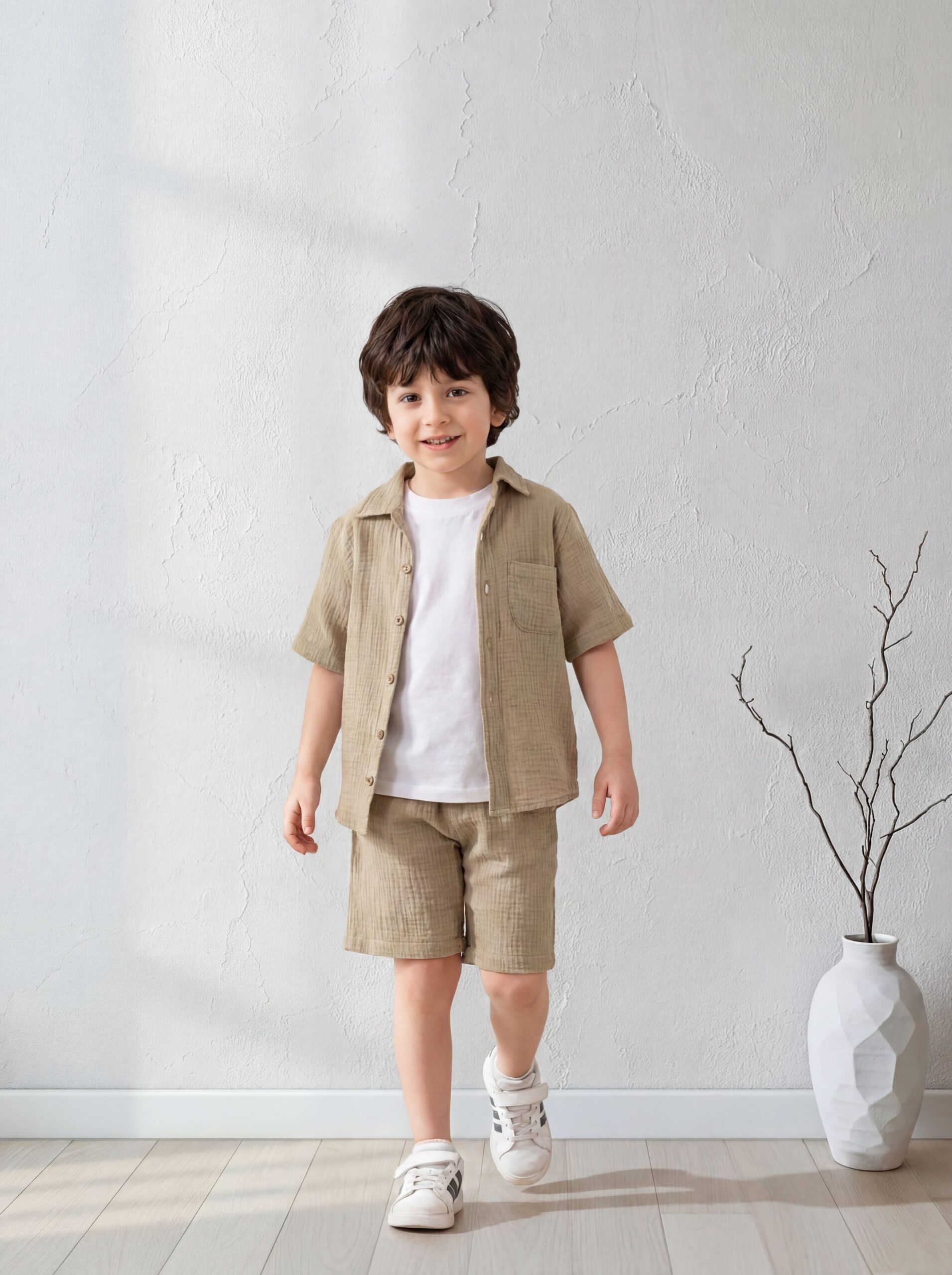 وصف المنتج يبدأ بالخامة الرائعة، حيث نقدم لكِ طقم صيفي قطعتين من براند A&A بلون زيتوني ساحر. الطقم مصنوع من قطن الموسلين الطبيعي، وهو الخيار الأمثل ضمن فئة ملابس أطفال الصيفية لضمان التهوية والانتعاش. القميص النص كم يأتي بتصميم كاجوال بجيوب أنيقة، مع شورت مريح يسمح لطفلك باللعب والجري بكل حرية.
