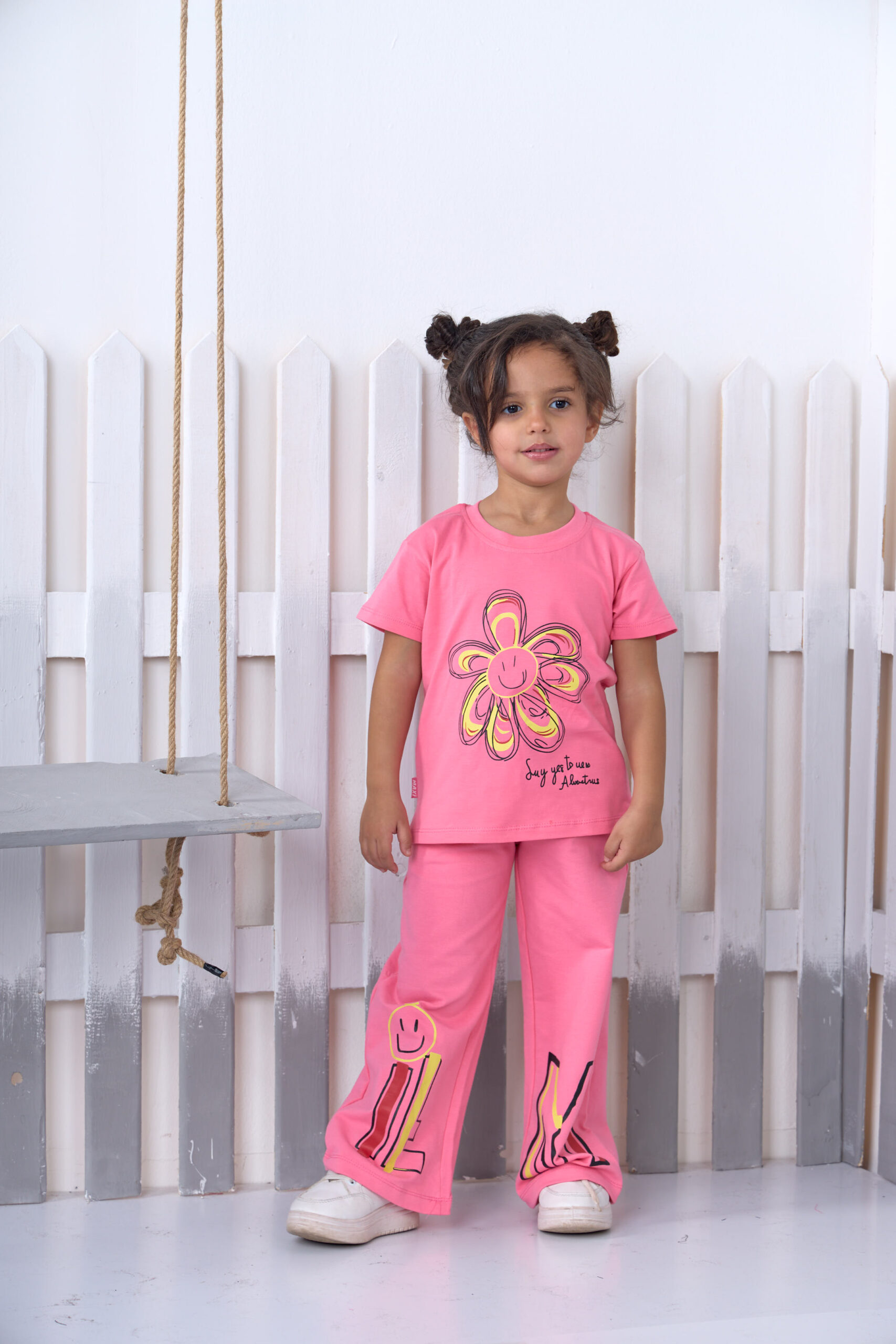 ملابس أطفال صيفية من براند A&A تجمع بين الشياكة والراحة اللي بنتك محتاجاها في الحر. الطقم مكون من قطعتين بلون بينك مبهج، التيشرت بنص كم والبنطلون بنظام الـ Wide Leg العصري المريح جداً في الحركة. صممنا الطقم ده من قطن ناعم عالي الجودة عشان يحافظ على بشرة بنات من 2 لـ 6 سنوات ويمنع التعرق طول اليوم.