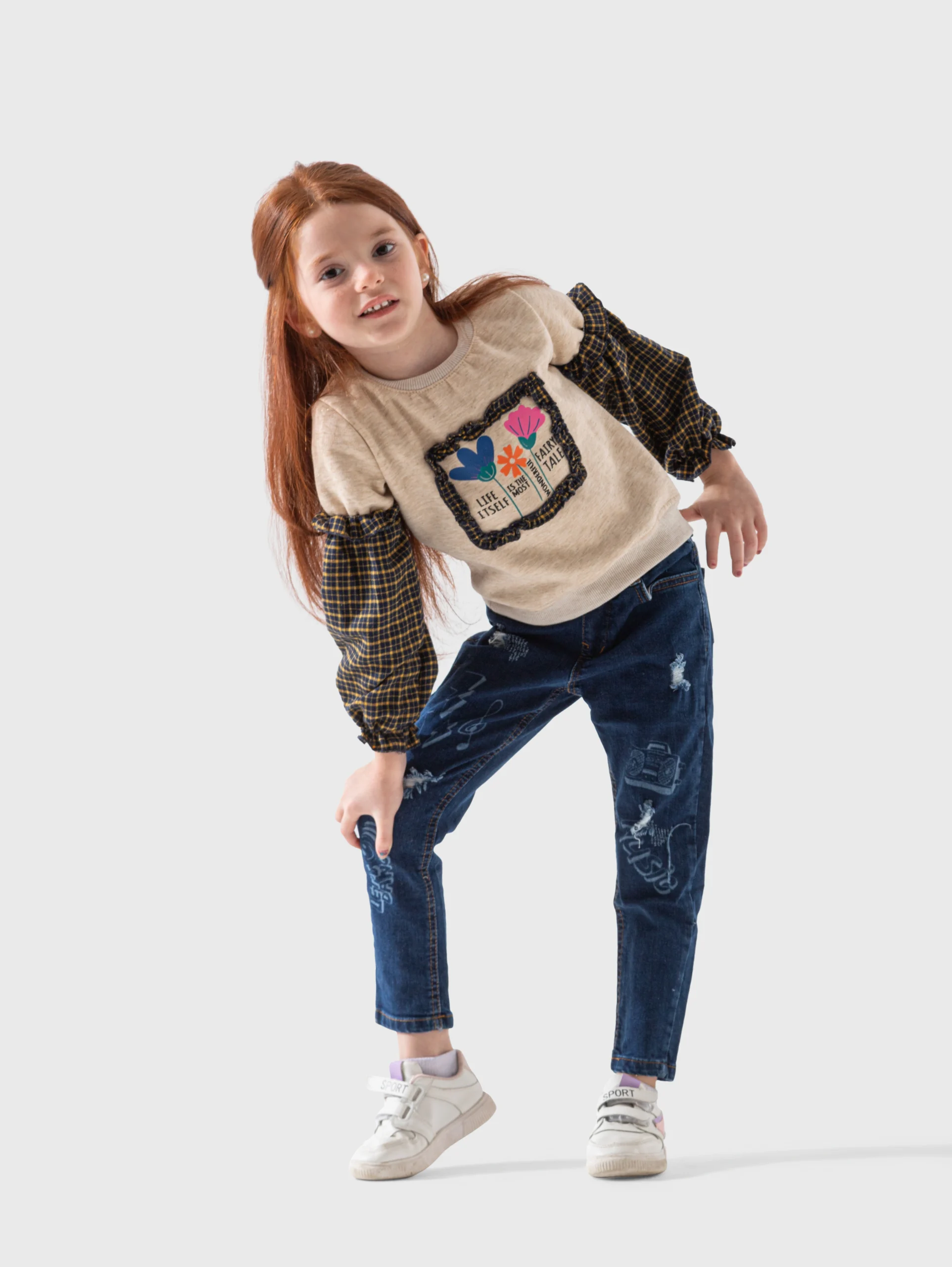 التصميم يركز على التفاصيل والفخامة؛ الجزء الأساسي بلون بيج فاتح، وزوّدنا الأكمام بقماش كاروهات مميز بتصميم منفوخ قليلاً. هذا المزيج العصري يمنح طفلتك مظهراً لافتاً. التطريز المُلفت على الصدر يضيف لمسة فنية وحيوية. القصّة مريحة وتسمح بالمرونة الكاملة للحركة واللعب.