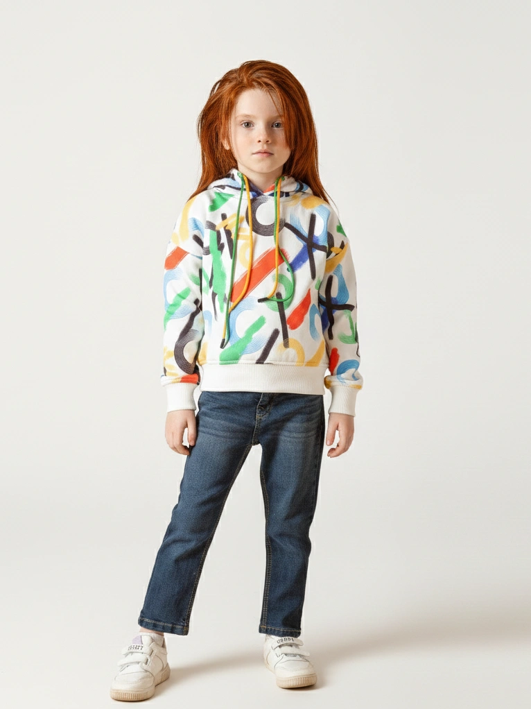 اللون الأبيض يبرز الطباعة الجرافيكية الملونة والنابضة بالحياة، مما يمنح طفلتك مظهراً لافتاً ومميزاً. القصّة المريحة للهودي وغطاء الرأس يضمنان لطفلتك سهولة الحركة الكاملة أثناء اللعب. الأربطة الملونة على الرأس تضيف تفصيلاً حيوياً وجذاباً، ويمكن تنسيقه مع الليجن الأسود أو الجينز الداكن.
