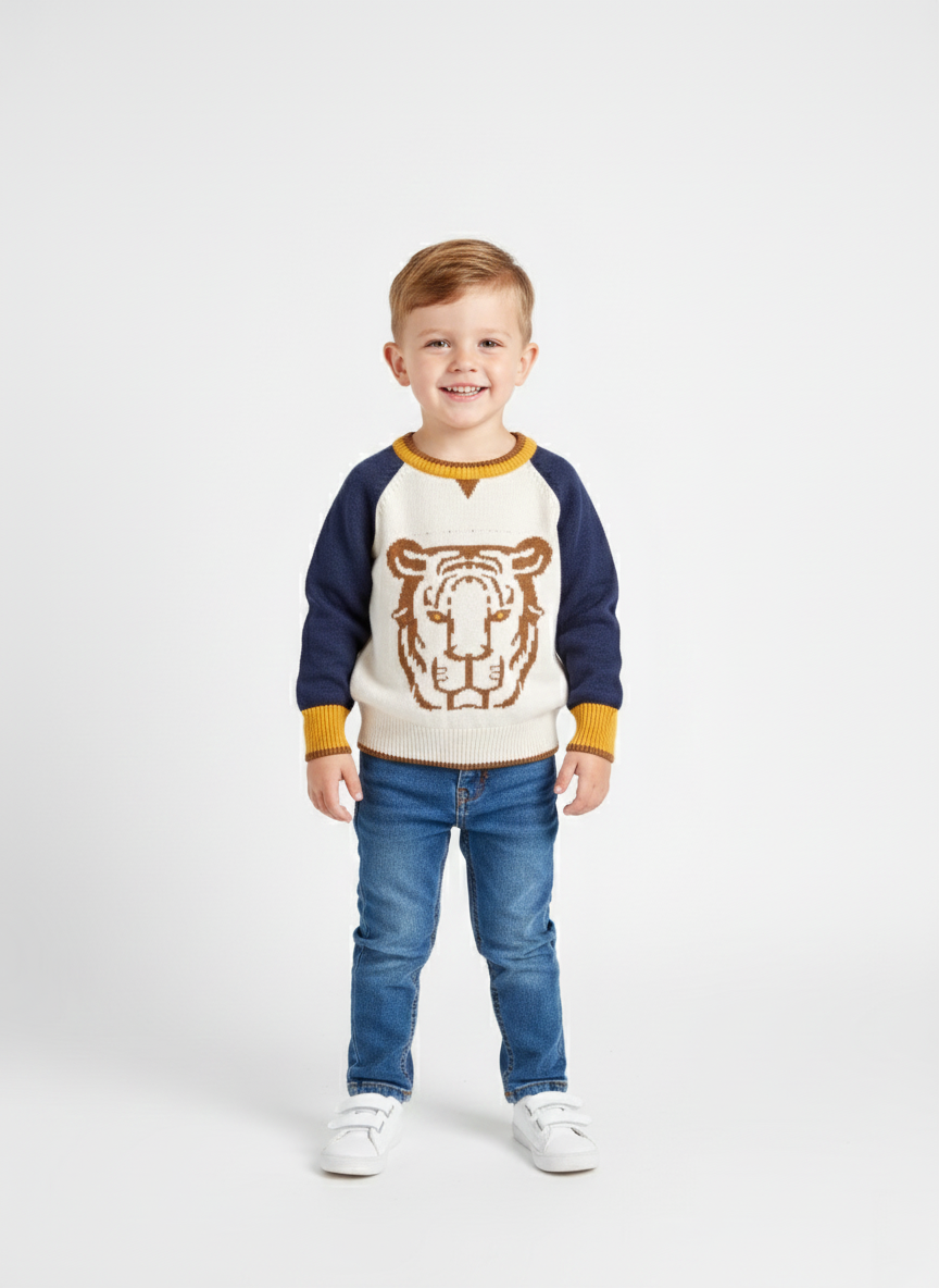 ملابس أطفال شتوية تجمع بين الدفء والأناقة من تشكيلة A&A الجديدة. يتميز هذا السويتر بخامة تريكو عالية الجودة وناعمة جدًا على بشرة طفلك الحساسة. التصميم يأتي بمزيج ألوان راقي يجمع بين الكريمي والأزرق الداكن مع لمسات المستردة الجذابة. تتوسط السويتر طبعة رأس نمر مميزة تمنح طفلك مظهرًا عصريًا وقويًا في كل خروجة. القطعة مثالية لفئة أولادى بيبي لأنها توفر حرية حركة كاملة أثناء اللعب والنشاط اليومي.