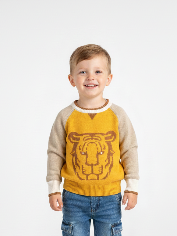 ملابس أطفال شتوية من براند A&A تجمع بين الدفء والأناقة في تصميم واحد. يتميز هذا السويتر بخامة التريكو الناعمة التي توفر الراحة القصوى لبشرة طفلك الحساسة. التصميم يأتي بلون أصفر مستردة جذاب مع أكمام بيج ورافعة برقبة دائرية مريحة جداً. تتوسط السويتر رسمة نمر مطرزة بدقة تمنح طفلك مظهراً عصرياً وقوياً في كل خروجة. هذه القطعة مثالية لفئة أولادى بيبى الذين يبحثون عن التميز والنشاط.