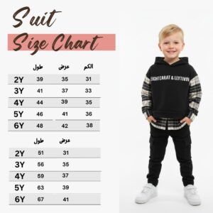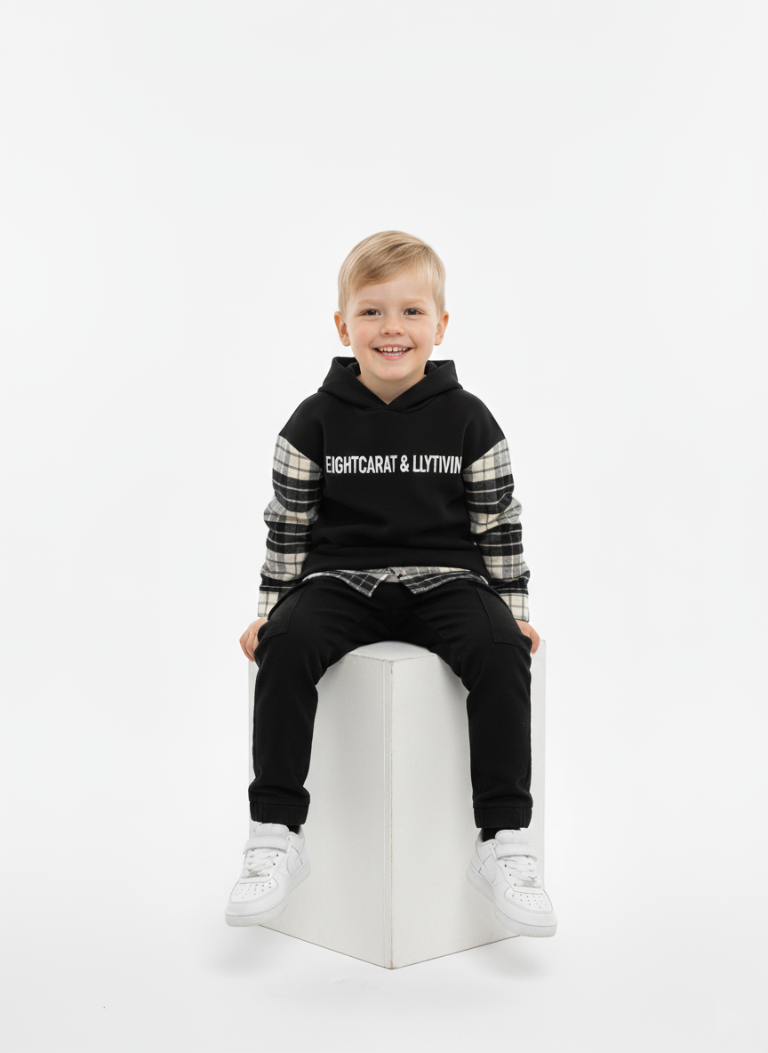 ملابس أطفال A&A تقدّم طقم سوت أولادي بتصميم عصري وجذاب. هذا الطقم يناسب الأولاد من عمر سنتين لـ 6 سنوات. الطقم قطعة واحدة مريحة وأنيقة في نفس الوقت. خامته قطن ميلتون دافئ ومريح. هذا يضمن دفء طفلك. يمنحه أيضاً مظهراً فريداً وعصرياً. الطقم يتكون من هودي أسود مميز مع تفاصيل كاروهات كأنها طبقة تحتية. تصميم الهودي يتميز بأكمام واسعة وقبعة مريحة.