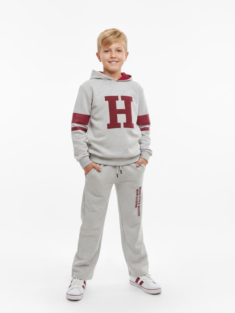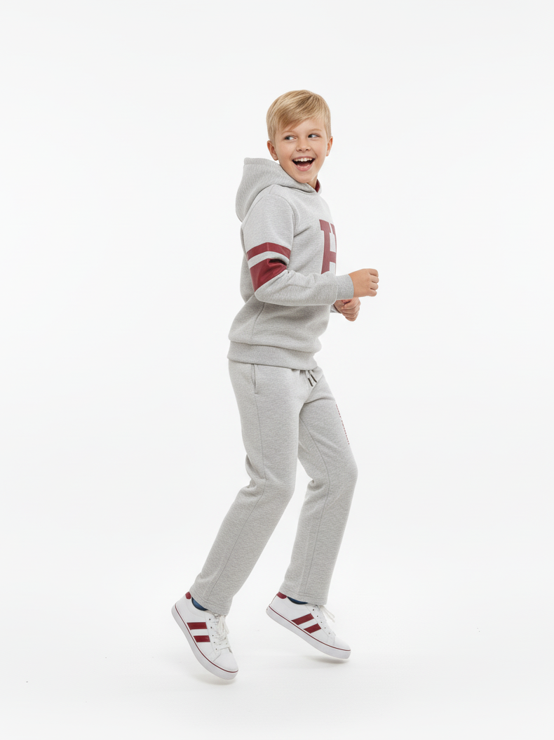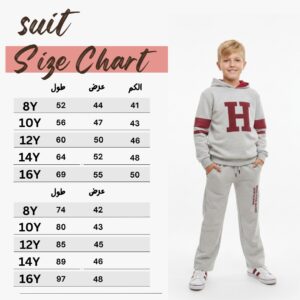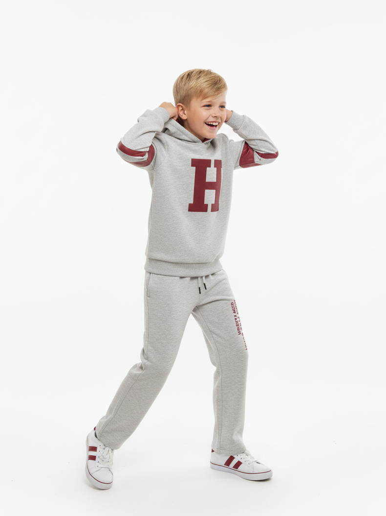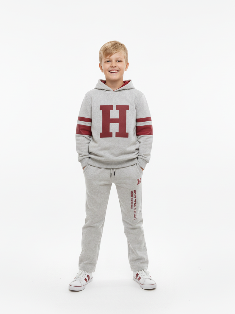 التصميم يجنن! يتميز الهودي بلون رمادي ميلانج عصري مع حرف “H” كبير باللون العنابي وتفاصيل شريطية على الأكمام، وده بيديله شكل جامعة أمريكية (Varsity Style) مميز. البنطال السويت بانتس مريح جداً بفضل الوسط المرن (Elastic Waist) والقماشة القطنية الناعمة، ومكتوب عليه شعار البراند بتصميم طولي بيزود من شياكته.