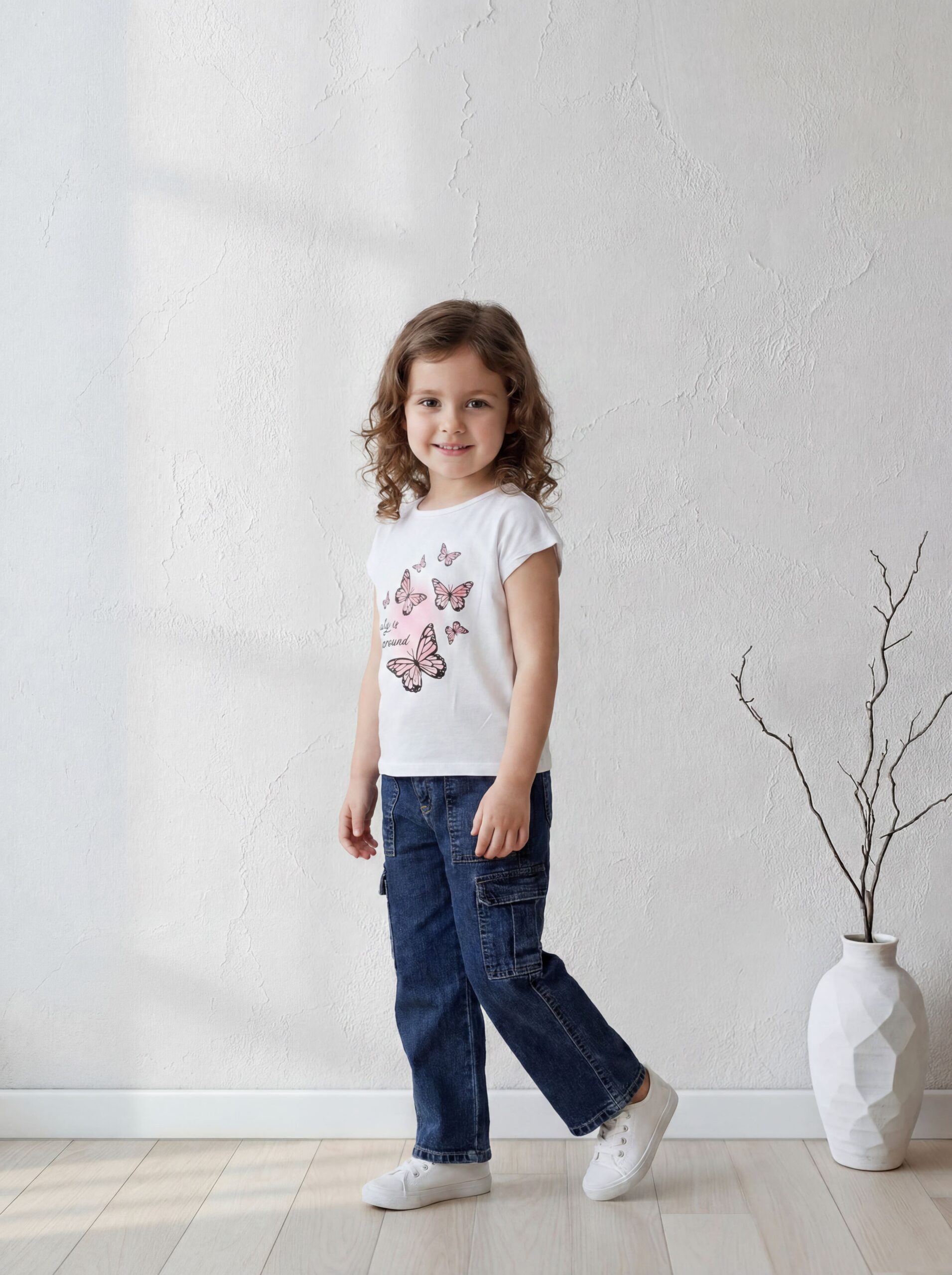 ملابس أطفال صيفية تجعل بنوتك رقيقة مثل الفراشة في كل الأوقات. يوفر لكِ براند A&A هذا التيشيرت الأبيض الصافي بتصميم مطبوع بفراشات وردية غاية في الرقة. اعتمدنا في التصنيع على القطن الطبيعي فائق الجودة لكي يمتص العرق ويمنح طفلتك انتعاشًا يدوم طول اليوم. يناسب هذا التيشيرت بنات من 2 لـ 6 سنوات اللاتي يفضلن الحركة واللعب بكل حرية.