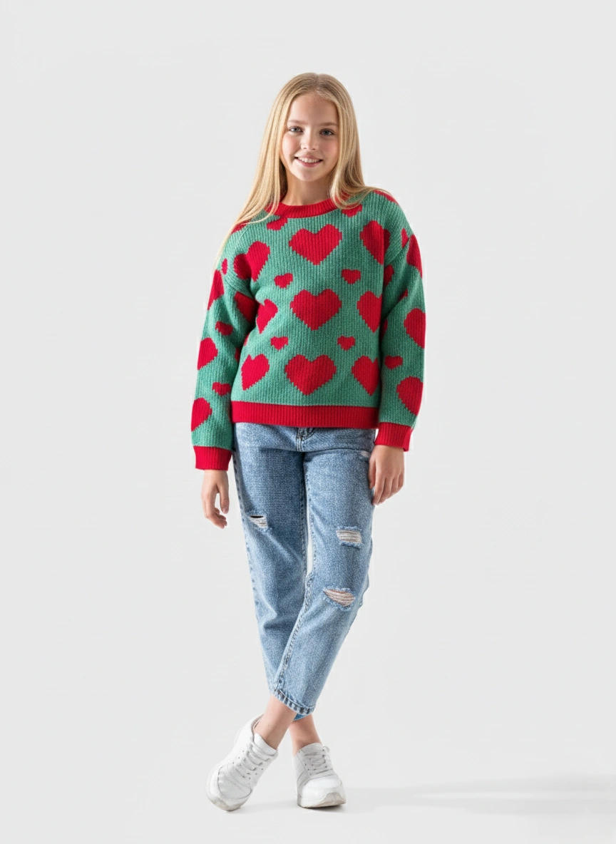 ملابس أطفال شتوية بتصميم يخطف القلب من تشكيلة A&A الجديدة. يتميز هذا السويتر بخامة تريكو ناعمة ودافئة جدًا، توفر لطفلتك الراحة التامة في الجو البارد. التصميم يأتي بلون أخضر جذاب مزين بقلوب حمراء مبهجة، مما يجعله قطعة مثالية للخروجات اليومية أو المناسبات العائلية السعيدة. صممنا هذا السويتر ليكون عمليًا جدًا مع بناتى كبير ليمنحهم حرية الحركة والنشاط طوال اليوم.