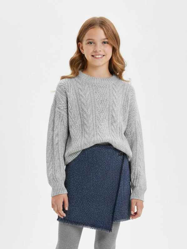 ملابس أطفال شتوية تجمع بين الدفء والأناقة بتصميم عصري من براند A&A. الطقم يتكون من بلوفر صوف رمادي بتفاصيل تريكو كلاسيكية تعطي مظهرًا فخمًا. السكيرت الكاروهات باللون الكحلي مصنوعة من خامة الجوخ الراقية التي تحمي طفلتك من البرد. هذا الطقم مثالي لـ بناتى كبير حيث يوفر لهن الراحة التامة أثناء الحركة والنشاط اليومي. القصّة المريحة تجعل طفلتك تشعر بالثقة والتميز في كل خروجة أو مناسبة خاصة.