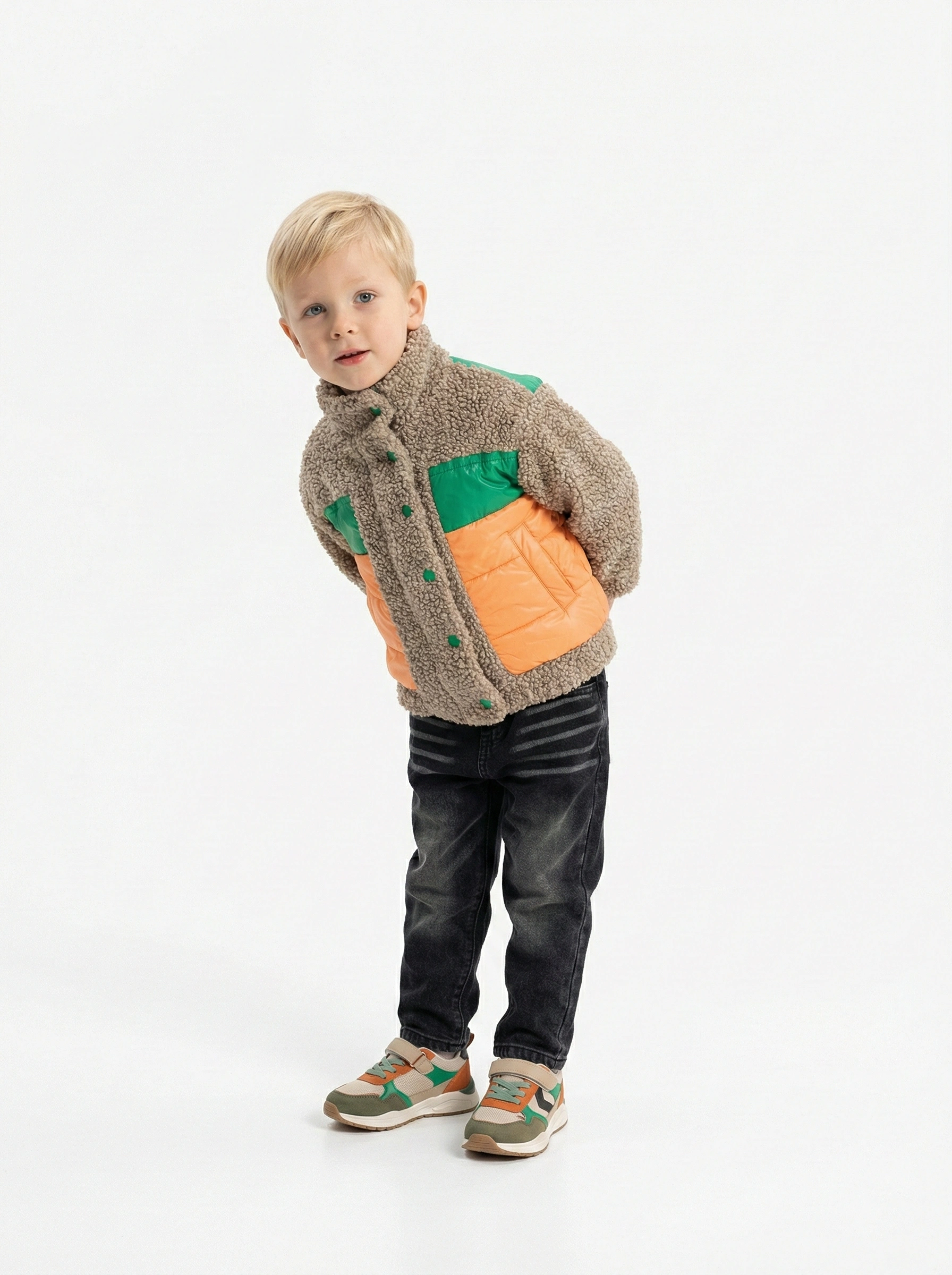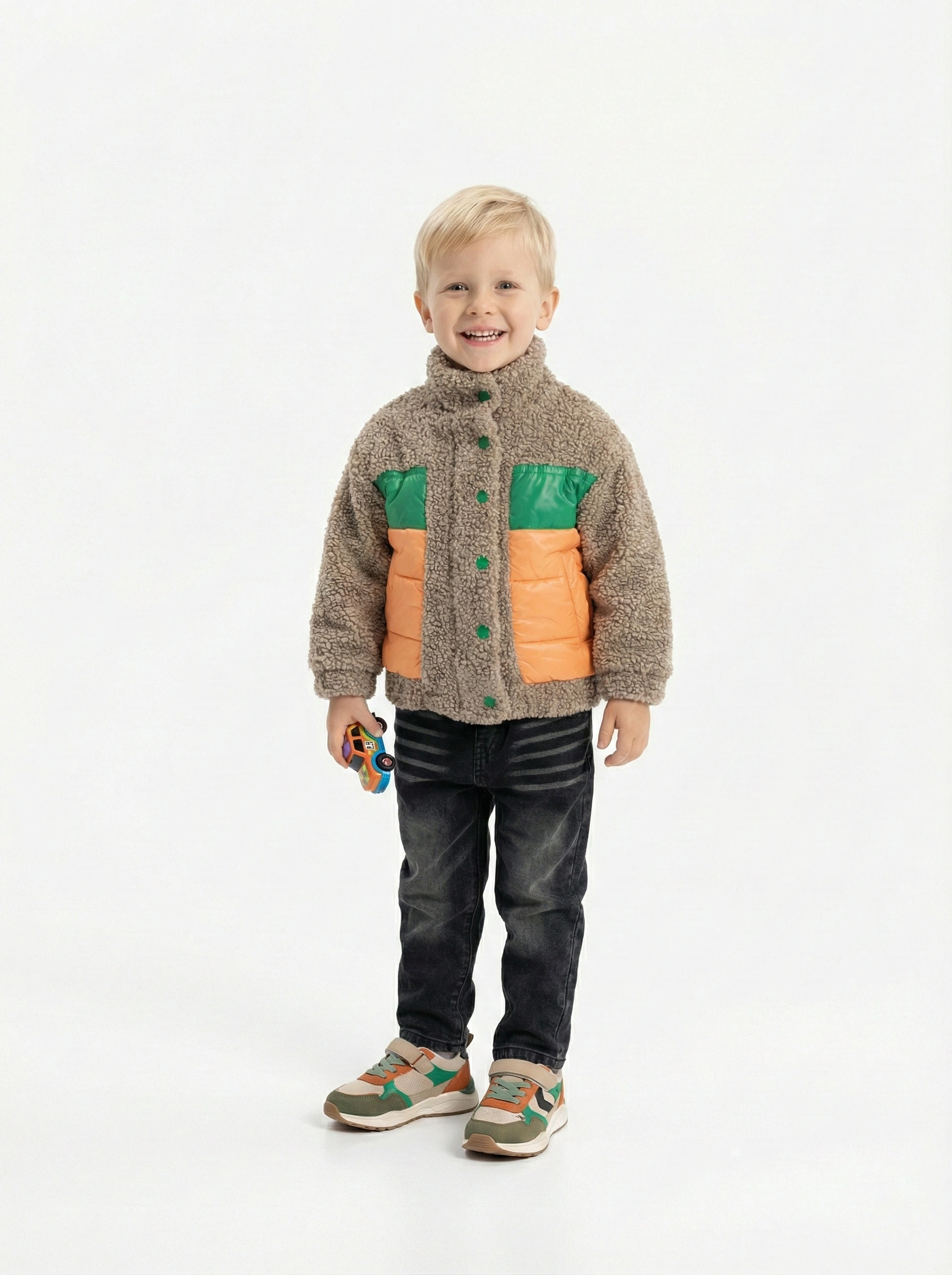 ملابس أطفال شتوية فاخرة تقدمها لكي علامة A&A بتصميم يجمع بين الدفء والأناقة العصرية. يتميز الجاكيت بخامة “تيدي” ناعمة للغاية توفر لصغيرك الدفء المثالي في الأيام الباردة. أضفنا لمسات ملونة بالأخضر والبرتقالي تمنح التصميم حيوية وتجعله قطعة فريدة في خزانة ملابس طفلك. القطعة مصممة بياقة مرتفعة لحماية الرقبة وأزرار أمامية سهلة الاستخدام تساعد الطفل على الاعتماد على نفسه.