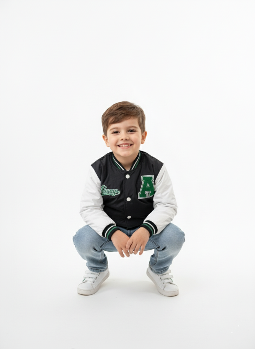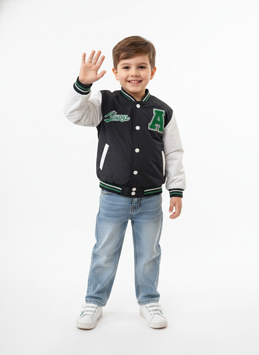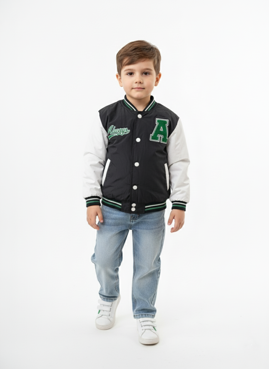 ملابس أطفال شتوية تجمع بين العملية والأناقة العصرية من براند A&A، نقدم لكِ جاكيت البيسبول المبطن (Varsity) المتاح بلونين رائعين (أبيض بأسود، وأسود بأبيض). يتميز الجاكيت بخامة شتوية ثقيلة ومبطنة بنقشة هندسية توفر الدفء التام لطفلك في الأيام الباردة. التصميم مزين بتطريز حرف A الأخضر الفخم وكلمة Always التي تمنحه مظهرًا رياضيًا أنيقًا. الأساور والرقبة مصنوعة من خامة مطاطية مخططة تضمن إحكام الغلق وحماية طفلك من الهواء.