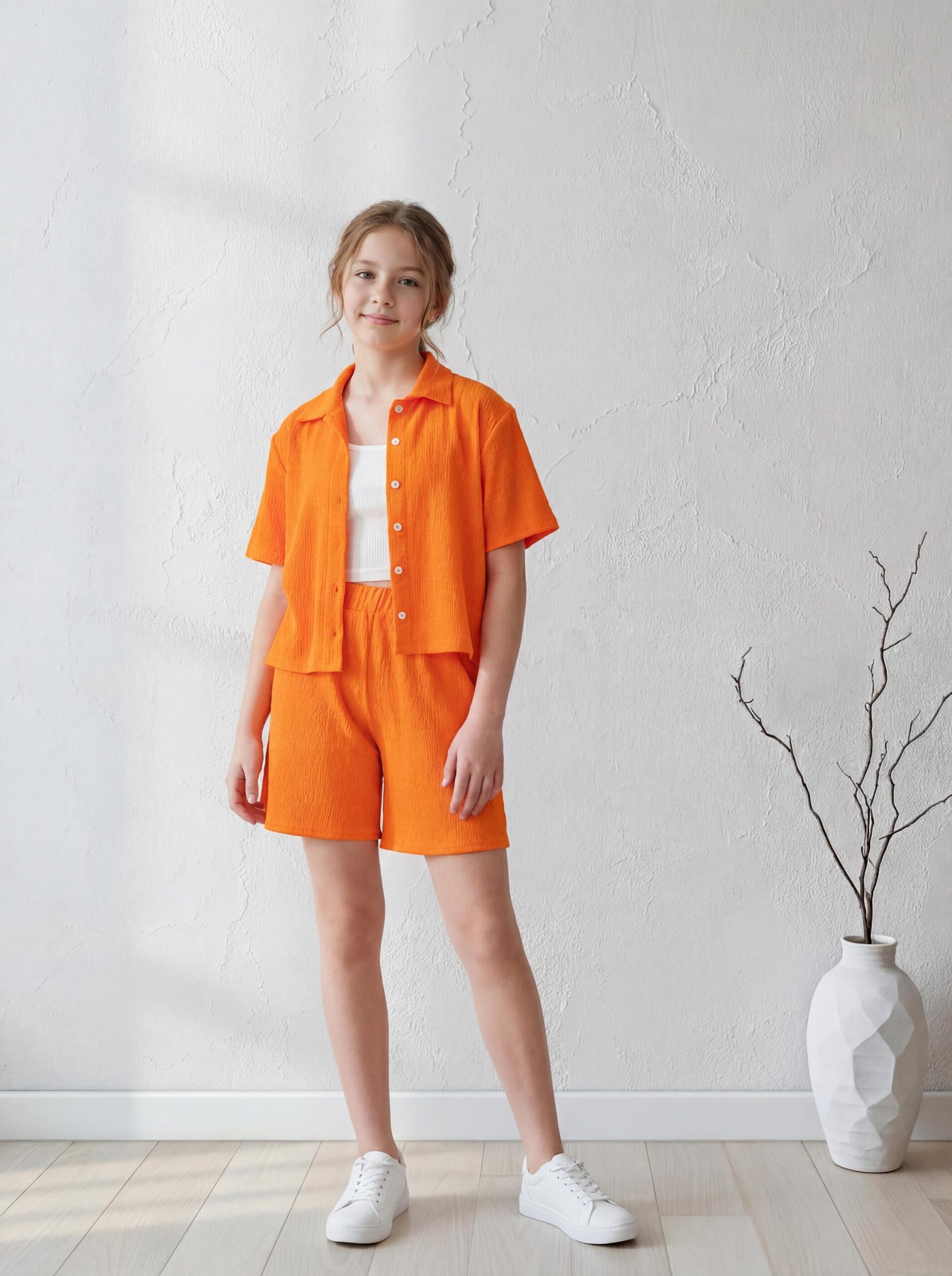 ملابس أطفال بتصميم “سوت” قطعتين مبهجة جداً بتقدمها لكِ براند A&A لكل أم بتدور على التميز. الطقم بيتكون من قميص نص كم وشورت بلون برتقالي (Orange) مشرق بيناسب طاقة وحيوية البنات في الصيف. القماش قطني بملمس كريب ناعم بيسمح لبشرة طفلتك بالتنفس ويوفر لها راحة قصوى في الجو الحر.