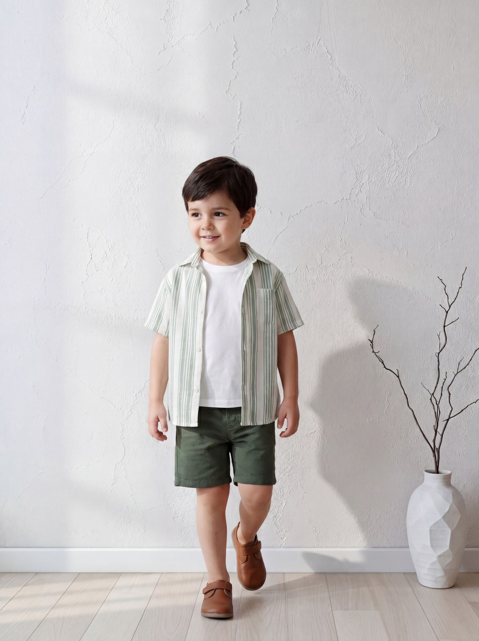 ملابس أطفال صيفية تمنح طفلك إطلالة مريحة ومنعشة تقدمها لكِ A&A بتصميمها الجديد لهذا الموسم. يتميز هذا القميص بخطوط طولية رقيقة باللون الأخضر الهادئ، مما يجعله قطعة مثالية لمظهر “كاجوال” أنيق. استخدمنا في تصنيعه أجود أنواع القطن الطبيعي الذي يسمح بمرور الهواء ويحمي بشرة طفلك من حرارة الصيف. القميص يأتي بنصف كم وقصة عملية تسهل الحركة واللعب طوال اليوم دون أي قيود.