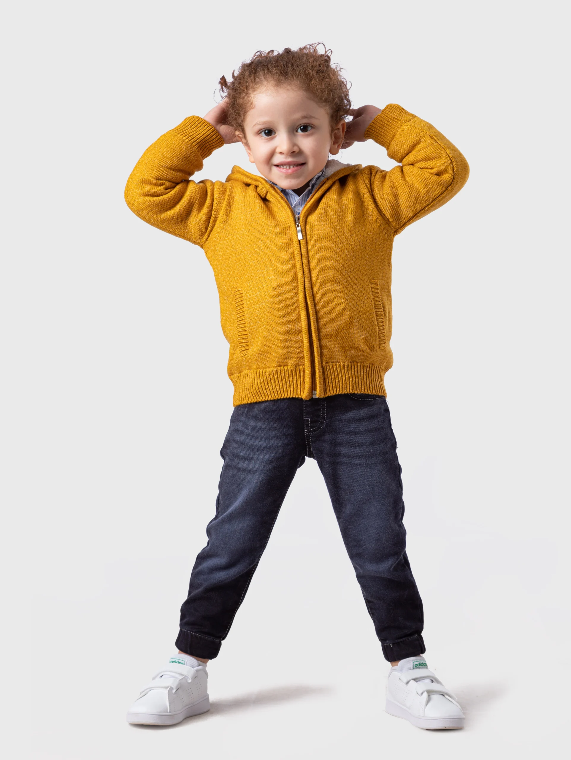الجاكيت مصنوع من خامة تريكو صوفية سميكة، مما يوفر عزلاً ممتازاً ودفئاً مثالياً لطفلك. يتميز بلونه الأصفر الخردلي (المستردة) السادة والمشرق، مما يجعله قطعة مميزة وجذابة. يأتيه بتصميم سحاب أمامي كامل لسهولة الارتداء والخلع، مع غطاء رأس متصل لتوفير حماية إضافية للرأس والأذنين من البرد. القصة المريحة والأطراف المضلعة تضمن ملاءمة جيدة وحرية في الحركة.