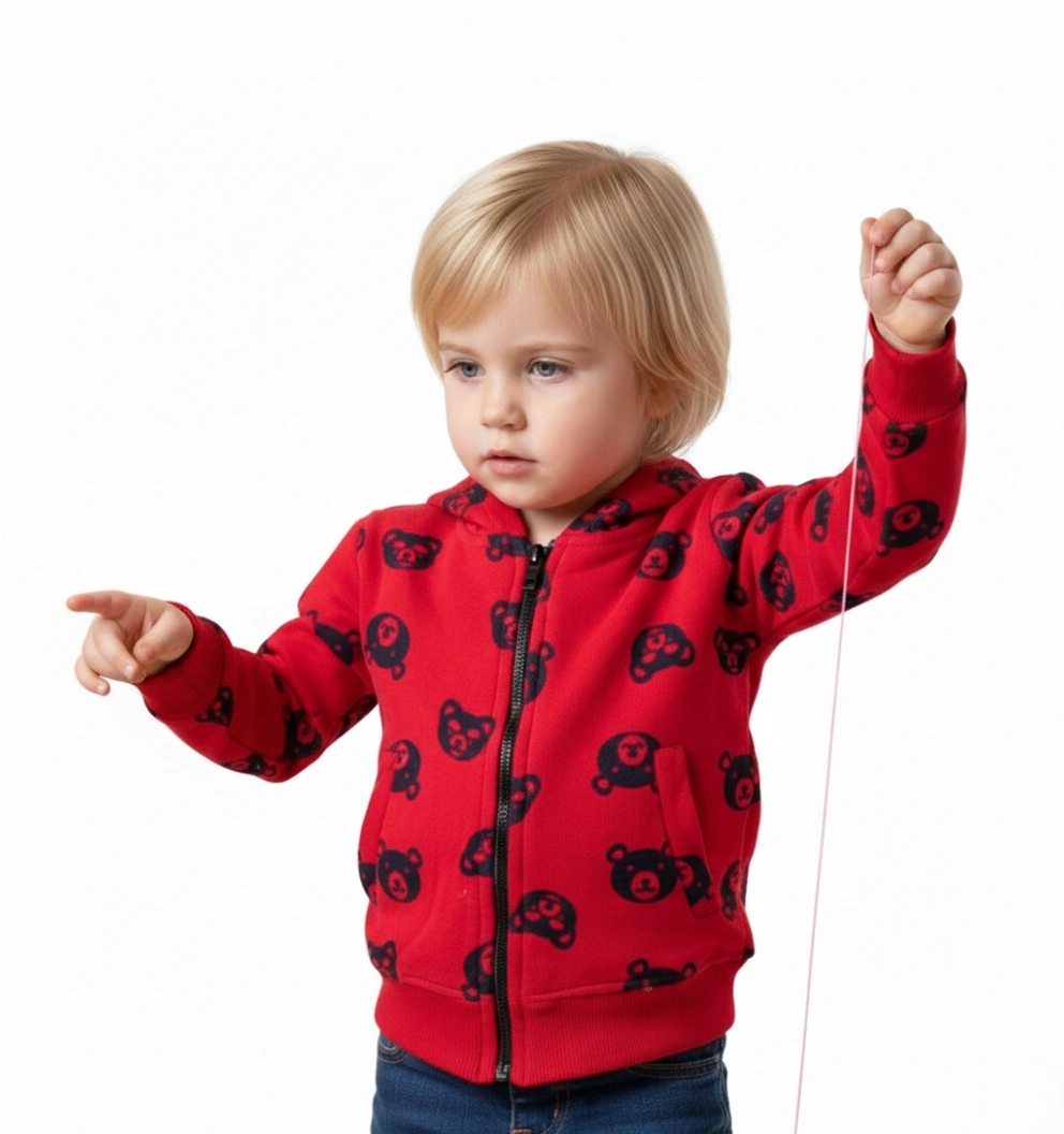 الجاكيت مصنوع من خامة سميكة ودافئة، مثالية للحماية من برد الشتاء. يتميز بلونه الأحمر الجذاب مع طبعة متكررة ورائعة لرؤوس الدببة السوداء على كامل الجاكيت. يأتي الجاكيت بـ سحاب أمامي كامل لسهولة تغيير الملابس والتحكم في التهوية. كما يحتوي على قبعة مبطنة لحماية رأس الطفل وأذنيّه، وأطراف مضلعة عند الأكمام والخصر لضمان ملاءمة مريحة. خيار ممتاز للعب في المنزل أو الخروج القصير.
